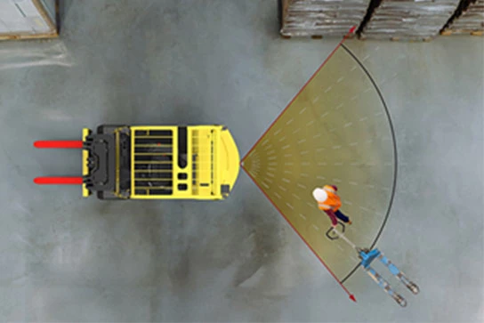 The pedestrian awareness camera system accurately identifies pedestrians at ranges up to 16 feet through a 110-degree field of view and provides your choice of automatic alerts to the forklift operator when a pedestrian is detected. The system can provide audible and visual alerts only, or also provide traction alerts, which automatically and gradually slow down the forklift. It can be used for both indoor and outdoor applications involving electric or internal combustion engine forklifts.