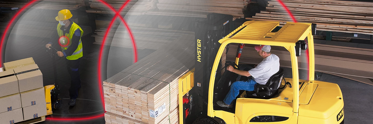When Hyster Reaction detects a pedestrian or obstacle in the path of travel, a location-based speed limit, or other condition, the system initiates a performance reduction that is noticeable to the operator as well as providing visual and audible alerts. These features support operator awareness and provide additional reaction time.